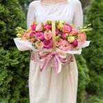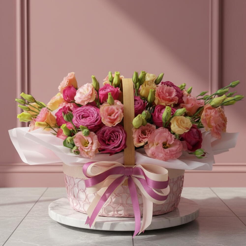 Composition: Lisianthus - 7, Rose spray Mansfield Park - 7, Basket - 1, ribbon - 2 Sizes: WIDTH - 35CM; HEIGHT - 30CM; LENGTH - 30CM; (including packaging) Размер: 35 x 30 x 30 см