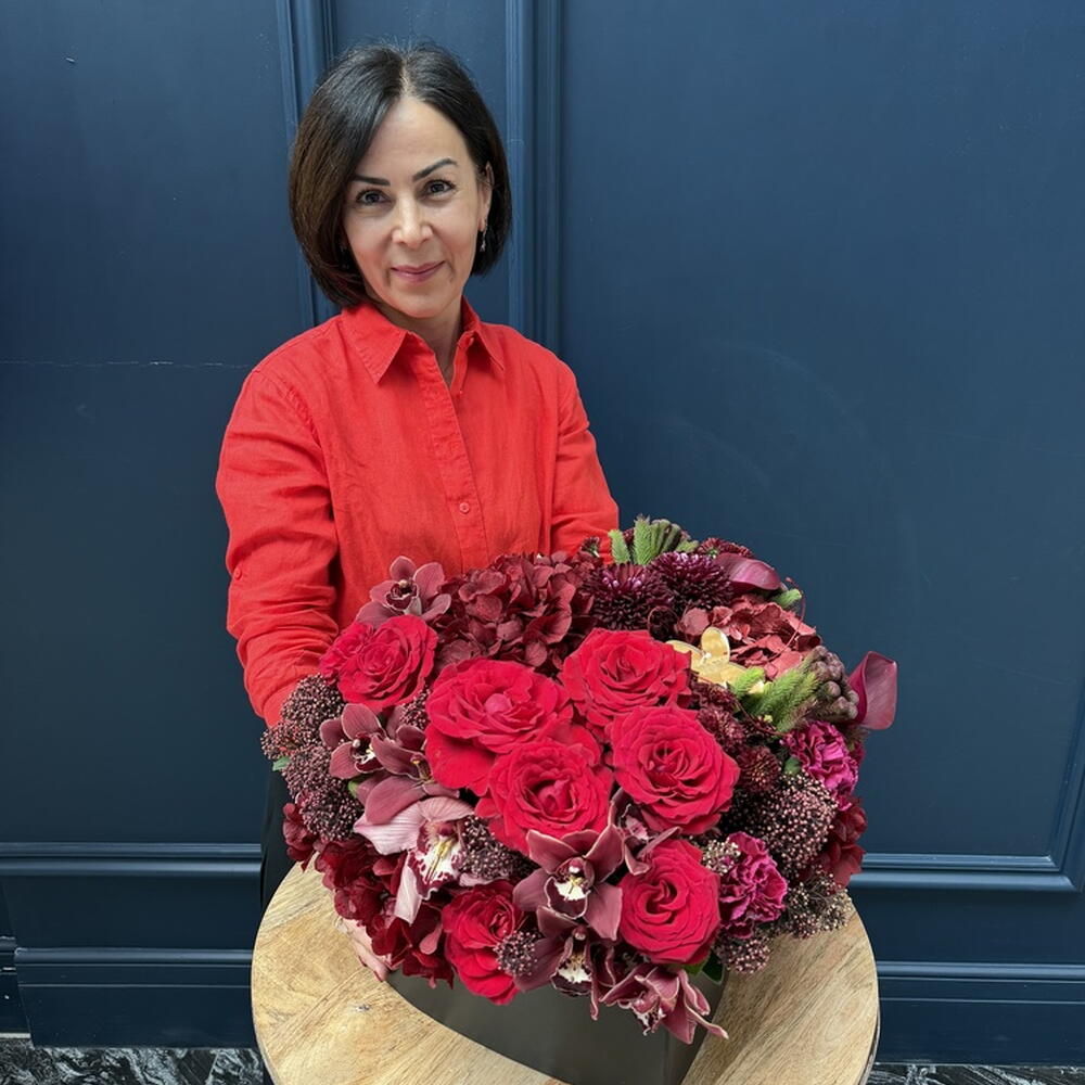 Hydrangea - 2 pce Chrysanthemum - 6 pce rose rouge - 10 pce arum - 3 pce cymbidium - 7 pce mélange d'œillets - 3 pce mélange de skimmia - 10 pce kaaps muricata - 3 pce