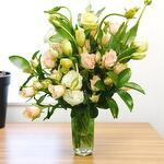 Ruscus - 5 pce Pink rose - 13 pce lisianthus white - 6 pce