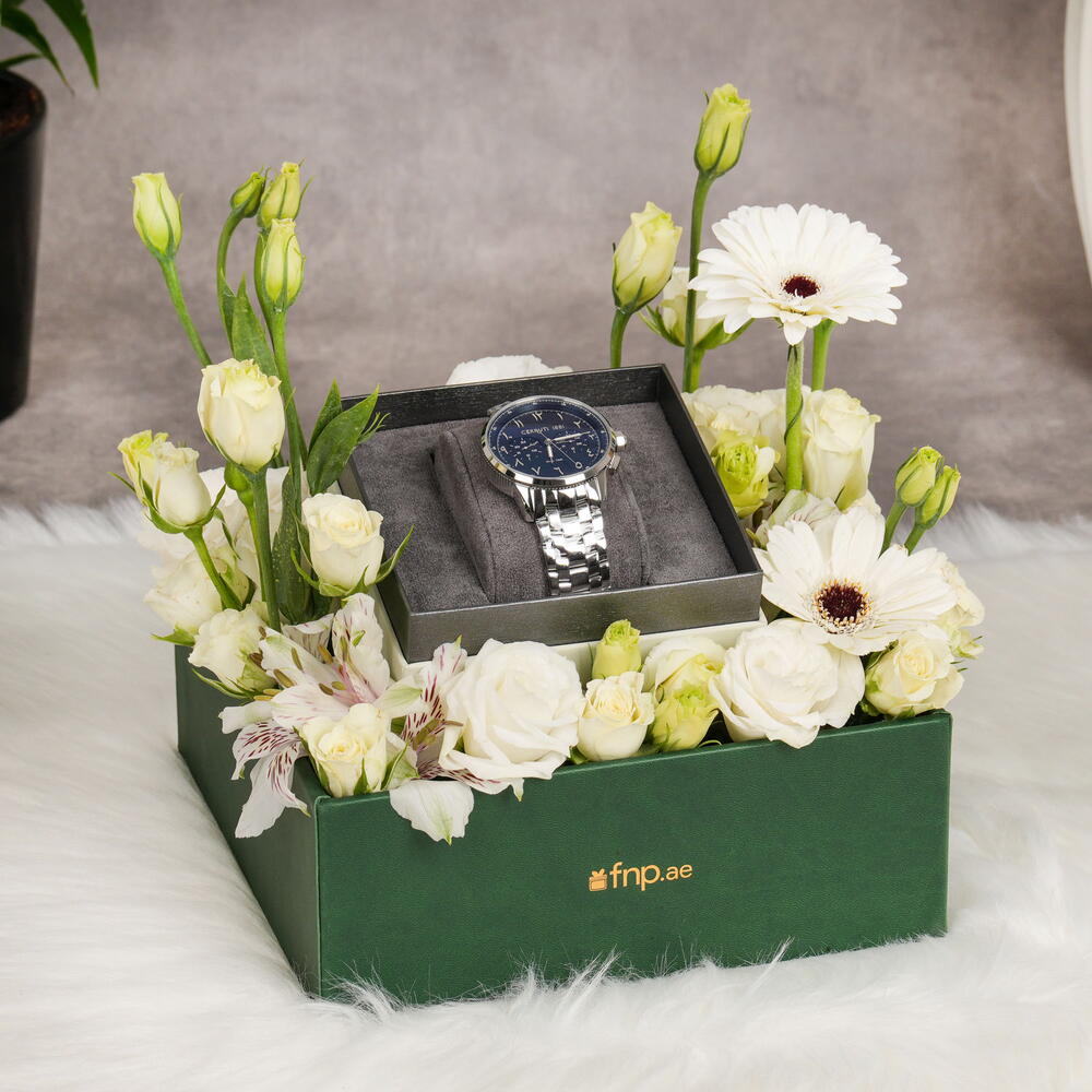 alstroemère blanche - 1 pce Gérbera blanche - 2 pce white spray rose - 2 pce lisianthus blanc - 2 pce 1 montre Cerruti - 1 pce