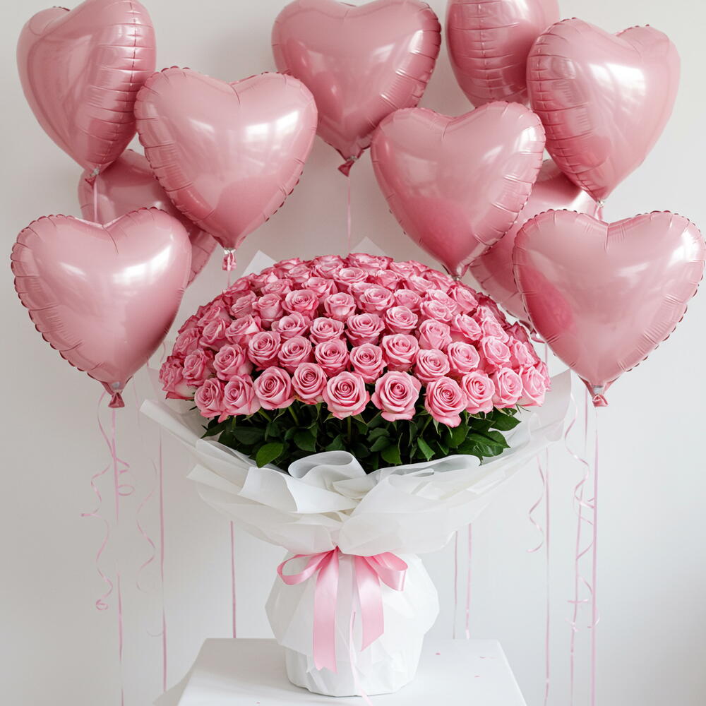 Un bouquet frais et parfumé de roses roses. Le nombre de ballons en forme de cœur que vous souhaitez, gonflés à l'hélium.