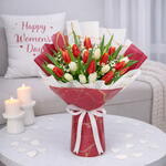 Des - Beautiful Bouquet of 19 Red and White Tulips with White wax in a Red and White Marble wrapping tied with a White ribbon Bow.