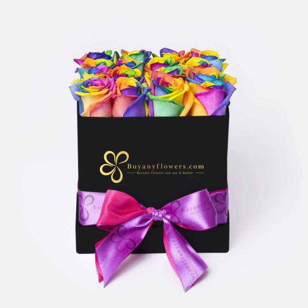 Product Details Arrangement of 20 to 22 Rainbow Forever Roses in Black Box.