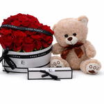 Une expression d'amour intemporelle comprenant 20–25 roses rouges fraîches, magnifiquement disposées dans une boîte à chapeau de luxe, accompagnées d'un adorable ours en peluche et d'un assortiment de 5 chocolats. Parfait pour les anniversaires, la Saint-Valentin, ou tout moment qui mérite quelque chose de vraiment spécial.