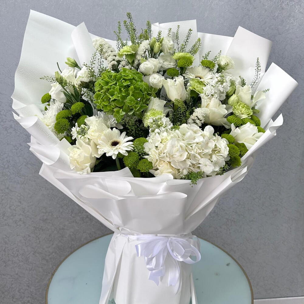 Fresh white and green mixed flowers beautifully arranged in an elegant white wrap, perfect for celebrations, gifting, and special occasions.