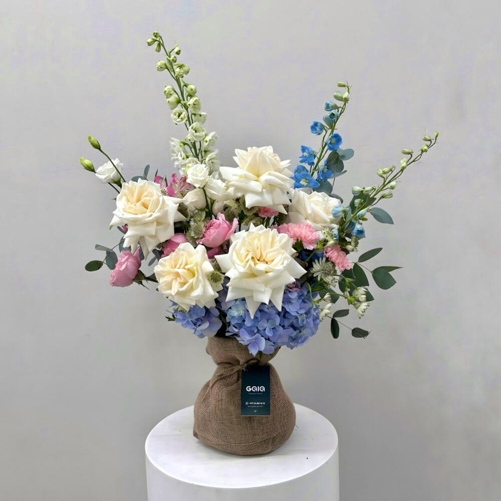 Sublimez votre espace avec ce chef-d'œuvre aérien d'un luxe à couper le souffle. Nous avons magistralement associé les couches opulentes et parfumées de roses Ohara blanches haut de gamme à la beauté architecturale élancée des delphiniums d'un bleu azur. 💙🦋 ✨ Idéal pour : félicitations d'entreprise haut de gamme, anniversaires élégants, célébrations de la naissance d'un petit garçon, ou un geste « Je pense à vous » sophistiqué. 🥰