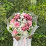 Ruban rose - 1 pce œillets blancs - 5 pce œillets roses - 5 pce ruscus vert - 6 pce gypsophiles - 4 pce alstroemère blanche - 3 pce alstroemeria rose - 3 pce couverture blanche - 4 pce