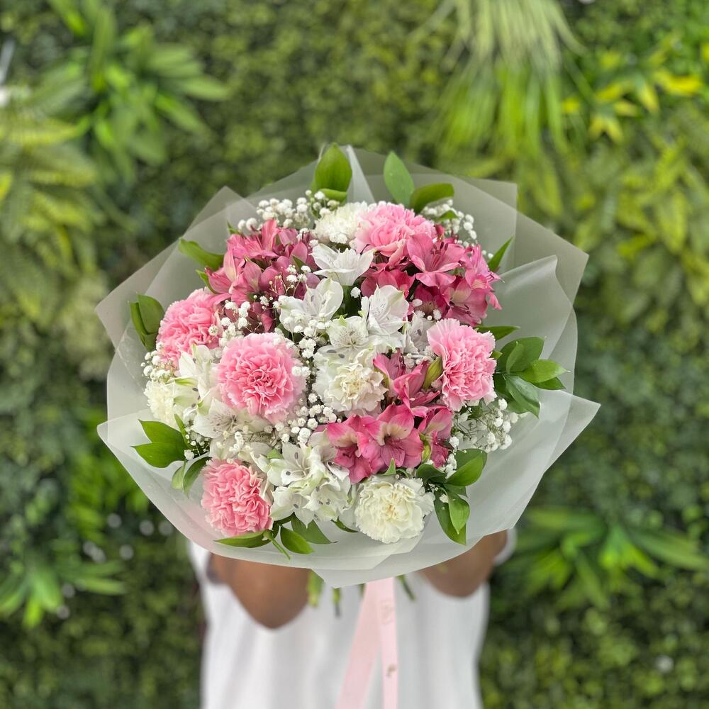 Ruban rose - 1 pce œillets blancs - 5 pce œillets roses - 5 pce ruscus vert - 6 pce gypsophiles - 4 pce alstroemère blanche - 3 pce alstroemeria rose - 3 pce couverture blanche - 4 pce