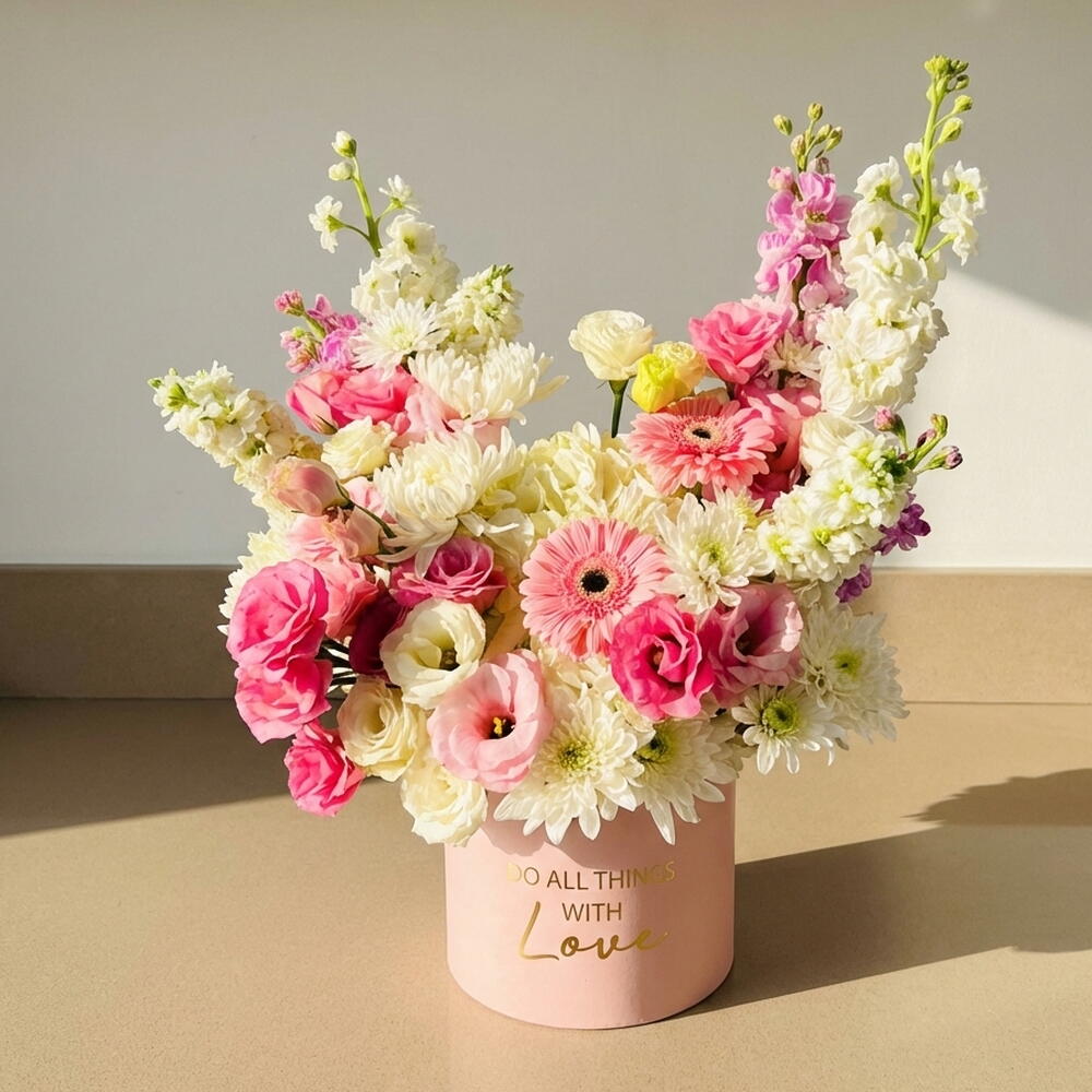 hortensia blanc - 1 pce gérbera rose - 2 pce matthiola blanche - 4 pce matthiola rose - 3 pce lisanthus blanc - 4 pce chrysanthème piña colada - 5 pce feuille pistache - 3 pce lisanthus rose - 6 pce