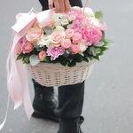 rose - 5 pce carnation - 10 pce tige de ruscus - 10 pce rose de jardin - 3 pce chry - 3 pce panier en bois sumal - 1 pce