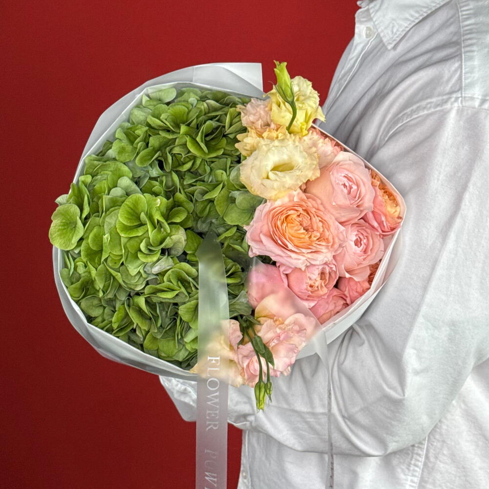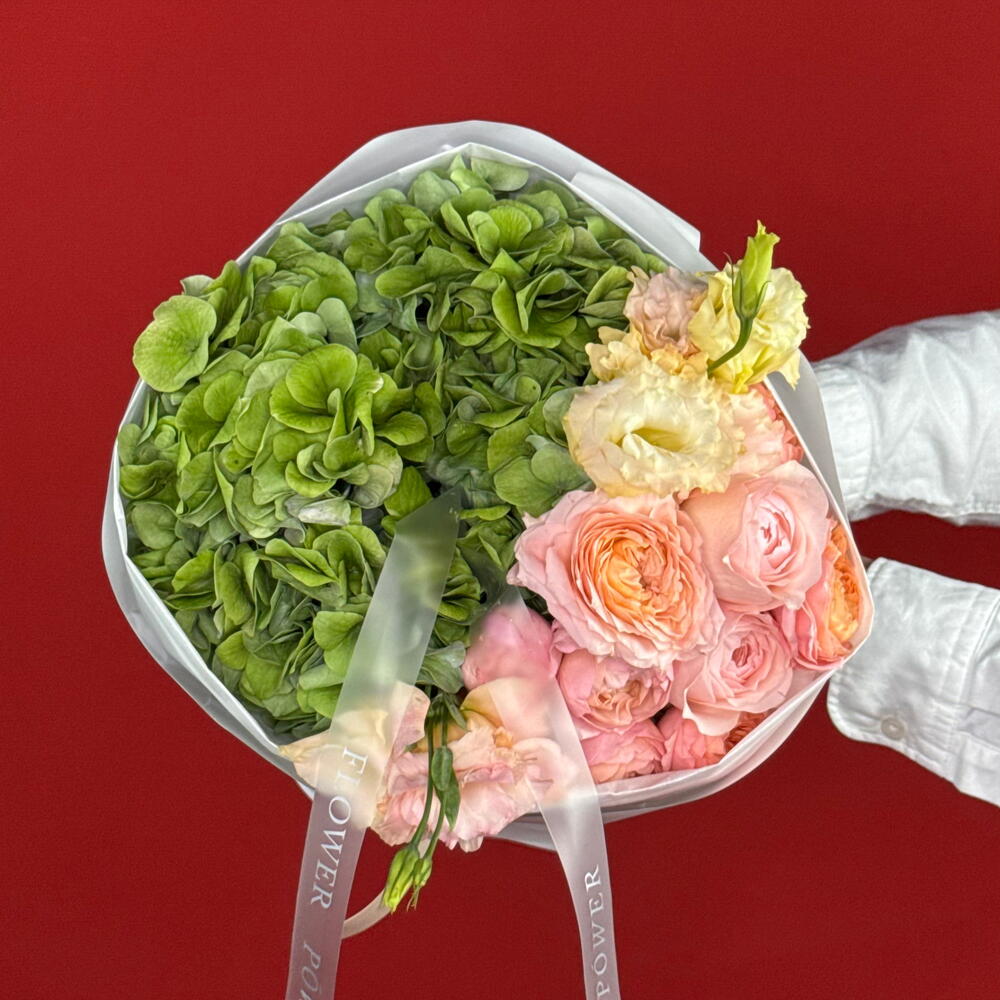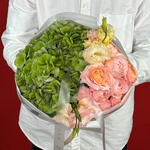 Eustoma - 2 pce rose - 2 pce hortensias verts - 1 pce spray roses - 3 pce