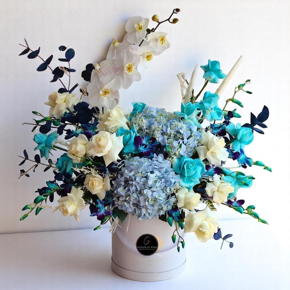 Coffret Gentleman Élégant – Phalaenopsis Blanc, Roses Bleues, Hortensias Orchidées