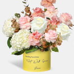 Succombez à la beauté intemporelle de notre composition Elegant Ivory, un délicieux mélange d'hortensia blanc, de Latte Rose, de roses rose, de roses blanches et d'eucalyptus.