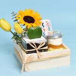 Eucalyptus - 1 pce Sunflower - 1 pce plante - 1 pce gypso - 1 pce tulipes jaunes - 2 pce bocal de cheesecake à la mangue - 1 pce mug bon rétablissement - 1 pce