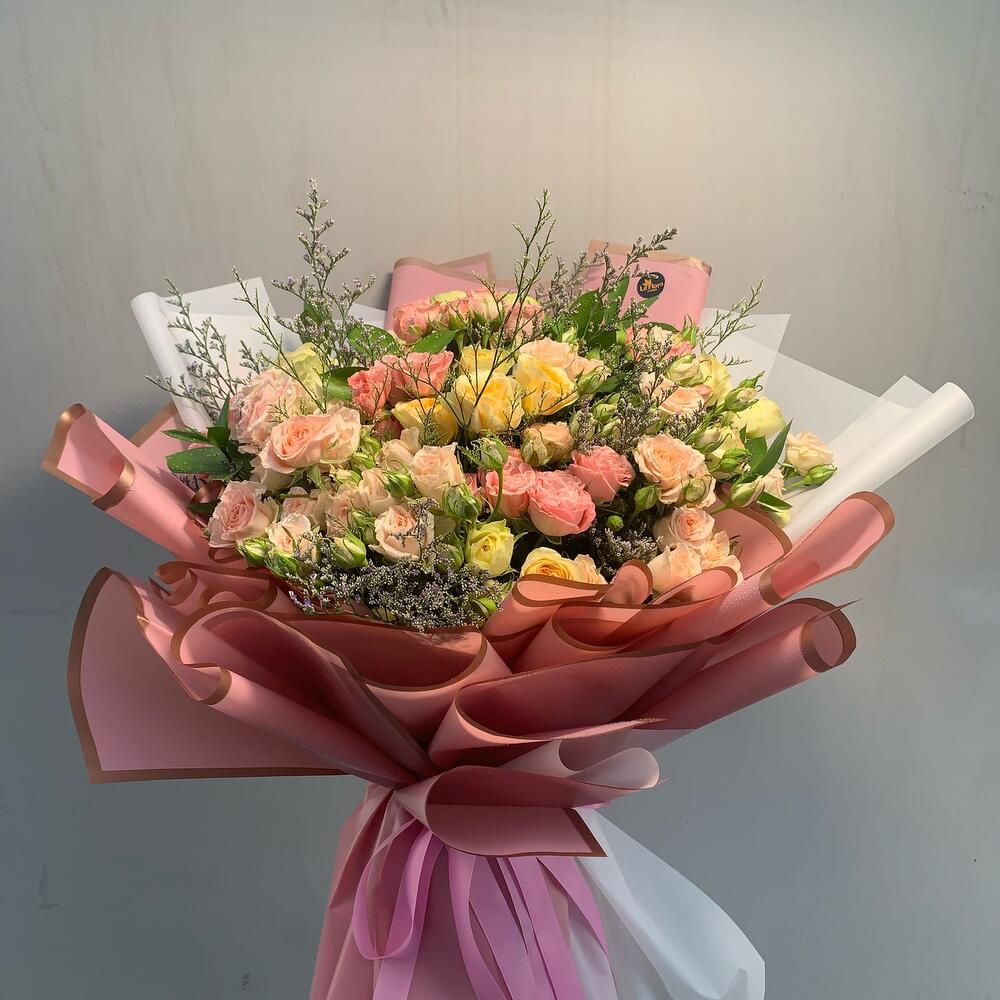 Ruscus - 4 pce Spray rose - 25 pce fleurs d'appoint en limonium - 10 pce