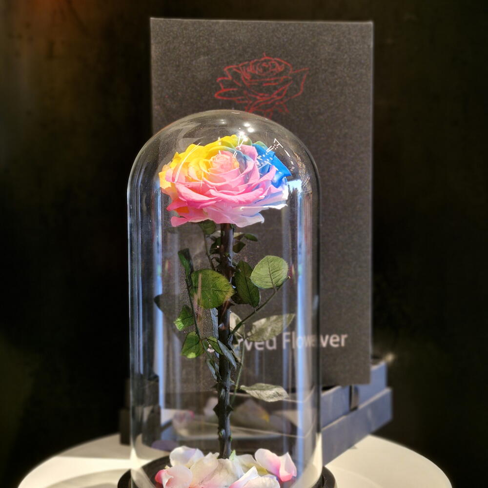 boîte noire - 1 pce cloche en verre avec base en bois noir - 1 pce rose préservée arc-en-ciel sous dôme - 1 pce