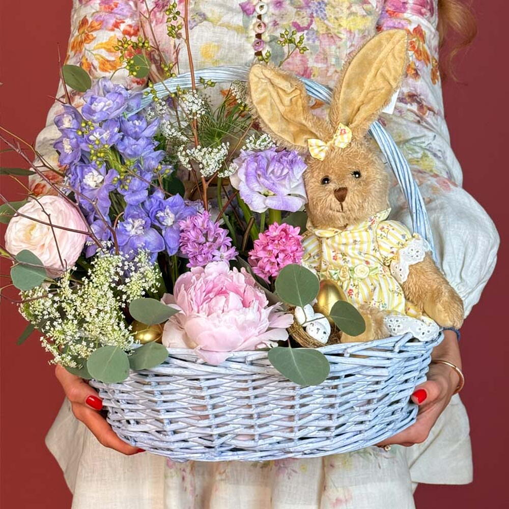 Nid d'Or: petit panier de fleurs avec peluche de lapin