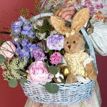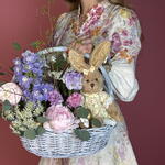 Un panier attendrissant et charmant présentant une délicieuse sélection de fleurs fraîches accompagnée d'une adorable peluche lapin. Cette composition évoque des sentiments de joie, de tendresse et d'affection douce, ce qui en fait le cadeau tout en douceur parfait. Idéal pour les annonces de naissance, les souhaits de prompt rétablissement ou pour célébrer l'anniversaire d'un enfant.