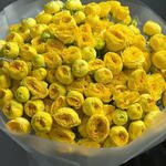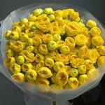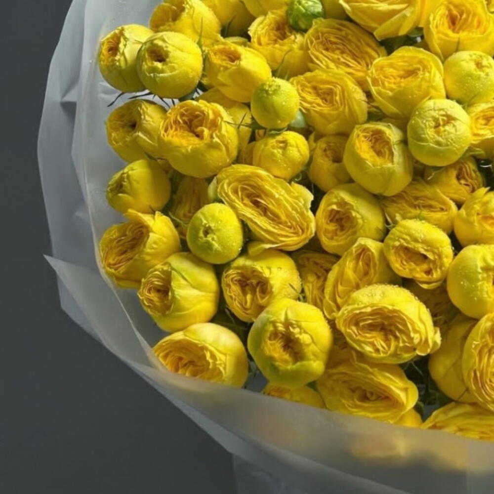 Un bouquet rayonnant de roses spray jaunes luxuriantes, débordant de chaleur et de joie. Chaque fleur est soigneusement disposée pour créer une forme ronde, pleine et semblable à un nuage, enveloppée élégamment dans un papier translucide doux pour une finition moderne et haut de gamme. Symbolisant le bonheur, l'amitié et les nouveaux départs, ce bouquet est parfait pour les anniversaires, les félicitations, les gestes de remerciement ou simplement pour égayer la journée de quelqu'un.