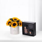Cette élégante composition florale met en scène sept tournesols d'un jaune éclatant, symboles de bonheur et de vitalité, magnifiquement contrastés par cinq tiges d'eucalyptus noir pour une touche moderne et spectaculaire. Soigneusement disposée dans une boîte ronde blanche ZUVEES Signature, elle rayonne d'équilibre et de charme, incarnant l'élégance à l'état pur. À côté des fleurs se trouve un duo gourmand de Lakrids by Bülow : D – Caramel Salé (Format Classique) et A – L'Original (Petit Format), alliant la douceur de la réglisse, l'onctuosité du caramel et la finesse du chocolat pour une touche luxueuse venue du Nord. Une harmonie raffinée de couleurs et de saveurs, conçue pour sublimer chaque occasion.