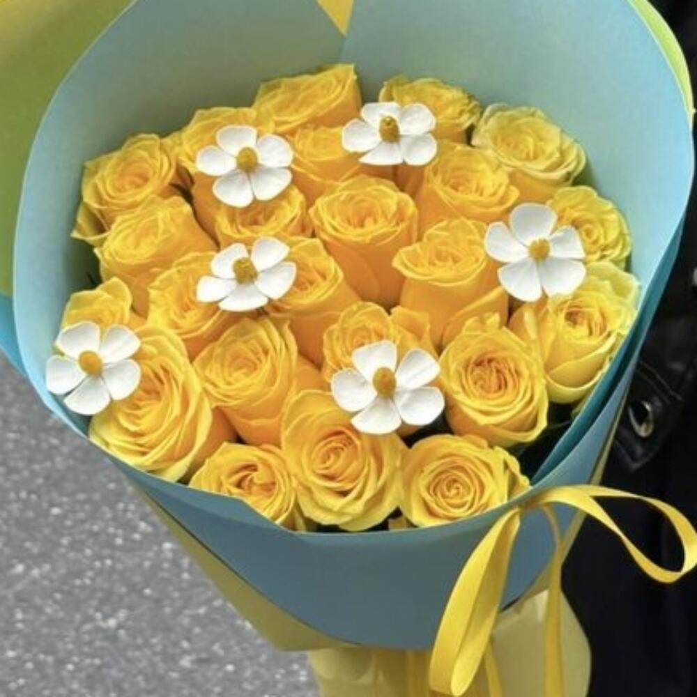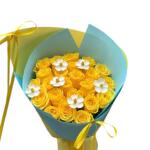 Illuminez la journée de quelqu'un avec notre bouquet *Sunshine Blooms* — une composition joyeuse de roses jaunes éclatantes accentuées par de délicates touches florales blanches. Enveloppé dans un papier aux couleurs pastel bleu et jaune et noué de rubans en satin assortis, ce bouquet dégage chaleur, bonheur et positivité. Parfait pour les anniversaires, les félicitations ou simplement pour faire plaisir !