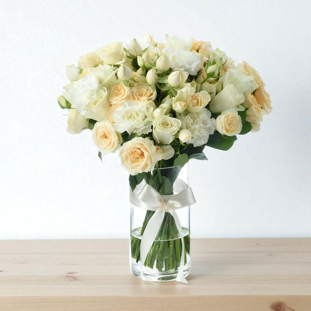 Disposée dans un vase cylindrique en verre élégant, cette composition est la pièce maîtresse parfaite pour exprimer des sentiments sincères. Les nuances de blanc doux et de pêche symbolisent la pureté, la gratitude et l'admiration, ce qui en fait un cadeau attentionné pour les moments les plus importants de la vie.