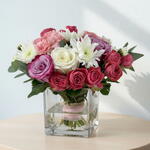 Vase - 1 pce rose branchue rose - 3 pce rose violette - 5 pce pink carnation - 3 pce chrysanthème blanc - 1 pce