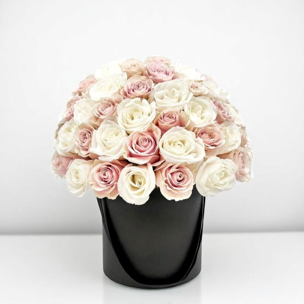 Un bouquet exquis de roses blanches et de roses rose pâle, soigneusement disposé dans une élégante boîte à chapeau noire. Cette composition florale raffinée trouve l'équilibre parfait entre élégance et tendresse, ce qui la rend idéale pour les occasions romantiques, les anniversaires ou pour une décoration intérieure gracieuse. Ses tons pastel doux et ses pétales veloutés créent une ambiance apaisante et luxueuse. Pour prolonger sa fraîcheur, conservez le bouquet dans un endroit frais à l'abri de la lumière directe du soleil. Ajoutez chaque jour une petite quantité d'eau à la mousse florale à l'intérieur de la boîte pour garder les roses hydratées et éclatantes.