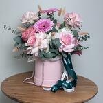 Eucalyptus - 3 pce lagurus - 3 pce hortensia blanc - 2 pce gérbera rose - 8 pce ohara rose rose - 5 pce rose bonbon - 5 pce