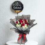 Célébrez un fier accomplissement avec élégance et panache. Ce combo de remise de diplôme comprend un ballon métallisé joyeux «Congrats Grad» associé à un bouquet saisissant de 21 roses rouges et blanches — symbolisant le succès, les nouveaux départs et des félicitations sincères. «Graduation Grace» est la façon parfaite d'honorer leur grand jour en pleine floraison.