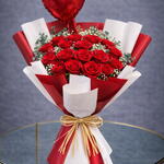 Bouquet de roses rouges avec un ballon en forme de cœur.