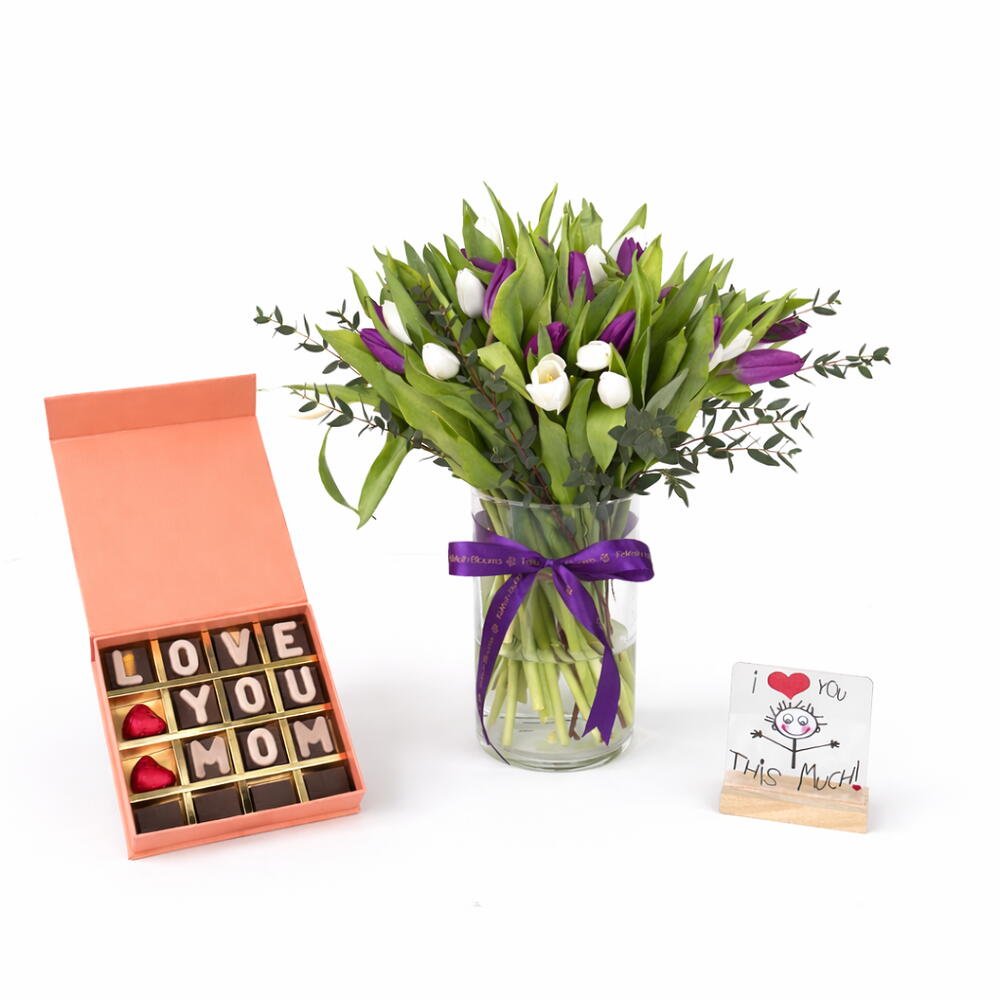 tulipes blanches - 16 pce tulipes violettes - 15 pce feuilles de pulviforea - 5 pce décoration de table je t'aime - 1 pce je t'aime maman chocolats assortis aux saveurs variées - 16 pce