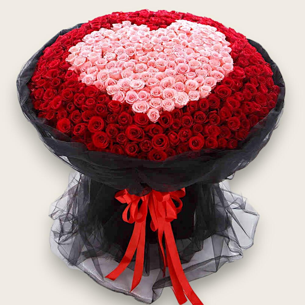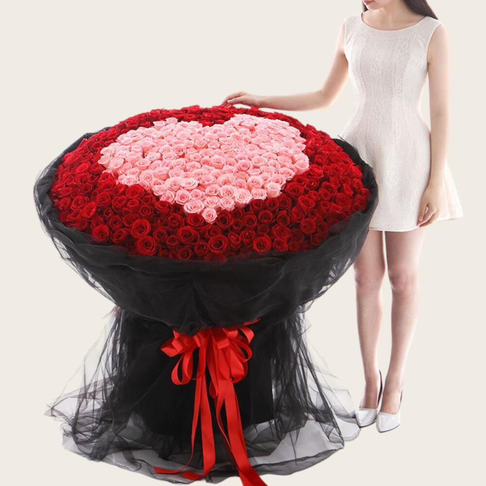 Déclarez votre amour de la manière la plus extraordinaire avec ce bouquet à couper le souffle composé de 800 roses fraîches et parfumées. Une symphonie de fleurs rouges et de délicates fleurs rose pâle s'entrelace pour créer un cœur dans un cœur, symbolisant la profondeur et les strates de votre affection. Ce geste grandiose est une expression inoubliable de passion, de beauté et de dévotion inébranlable.