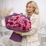 • 101 roses mélangées (tiges de qualité supérieure de 50 à 60 cm) • Roses fraîches de luxe à longues tiges • Emballées dans un élégant papier blanc et violet • Ornées d'un ruban rouge de qualité supérieure • Composition florale artisanale • Idéales pour la Saint-Valentin, les anniversaires et les occasions spéciales