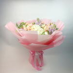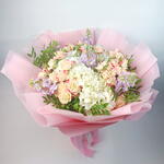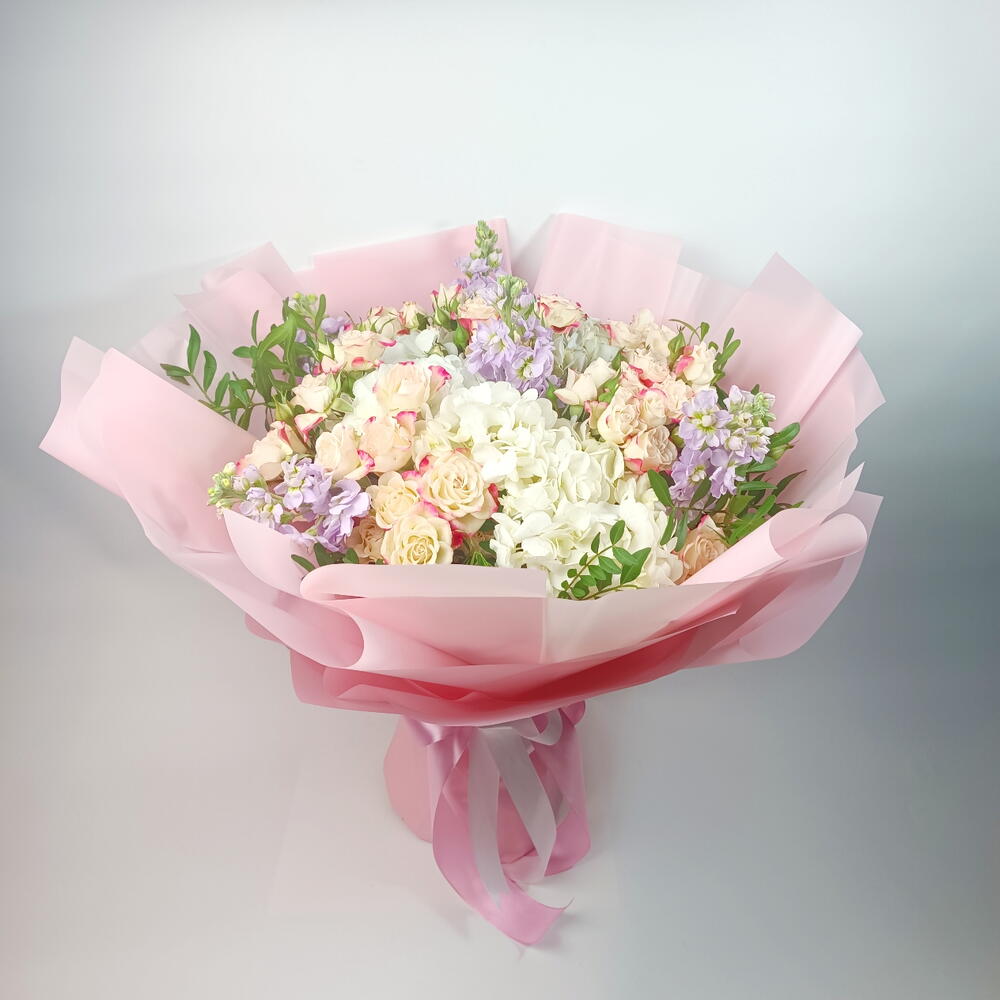 hortensia blanc - 3 pce spray de roses roses - 15 pce matiola violet clair - 5 pce feuilles de pestacia - 4 pce