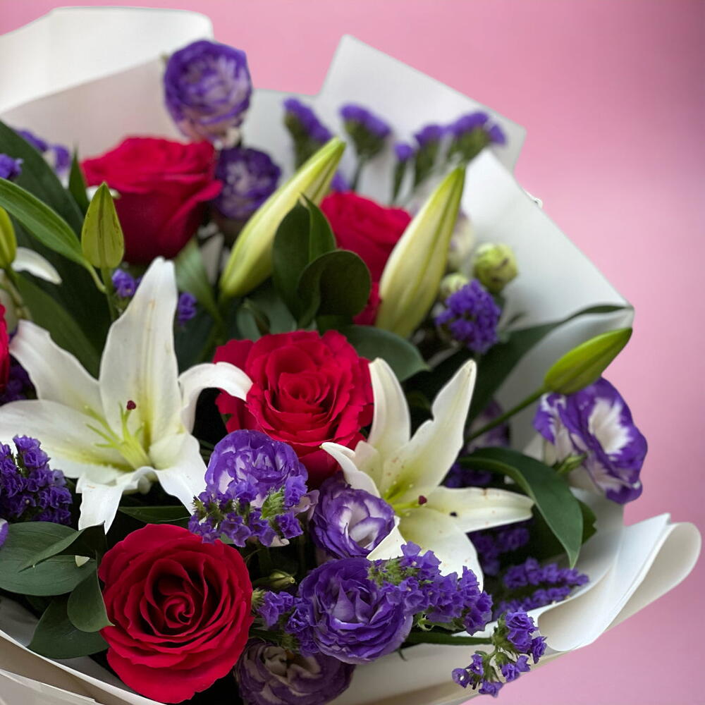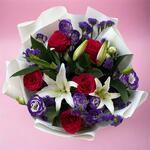 lisianthus violet - 4 pce lys blancs - 2 pce statice violette - 2 pce roses fuchsia - 5 pce