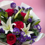 Célébrez les occasions spéciales avec style grâce à notre exquis bouquet, un choix splendide pour exprimer votre gratitude, adresser des vœux d'anniversaire ou créer des moments inoubliables lors d'un anniversaire heureux. Confectionné avec une attention méticuleuse aux moindres détails, cet arrangement présente un mélange envoûtant de lys rose délicat, de roses fuchsia captivantes, de lisianthus élégants d'un violet royal et de statice charmante aux doux tons rosés. L'harmonie de ces fleurs envoûtantes garantit un cadeau véritablement remarquable qui laissera une impression durable et remplira le cœur du destinataire de joie.