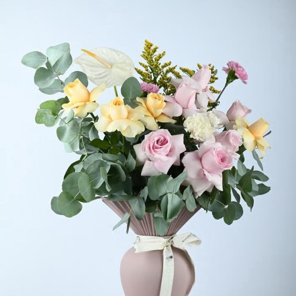Statice - 3 pce Pink rose - 6 pce Anthurium - 1 pce Yellow rose - 5 pce Vase - 1 pce œillets blancs - 3 pce eucalyptus - 20 pce œillet rose - 3 pce