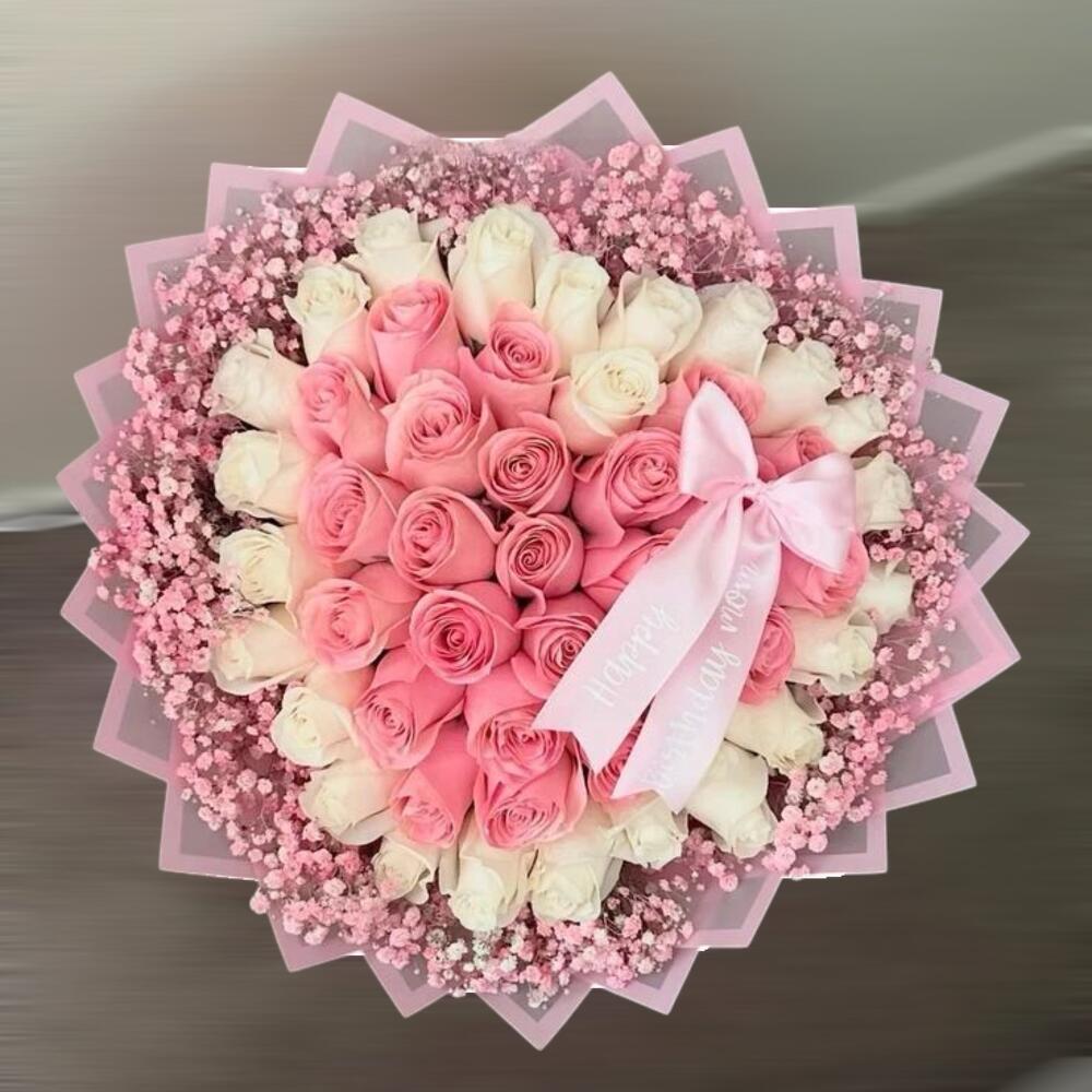 C'est une luxueuse composition florale ronde composée de roses rose et ivoire. Les roses blanches sont soigneusement disposées en forme de cœur au centre, entourées d'une riche bordure de roses rouges. Un ruban beige avec un nœud et les mots Te quiero mucho (en espagnol : « je t'aime beaucoup ») ajoute une touche personnelle et romantique. Le bouquet est encadré de couches de papier blanc translucide décoratif, lui donnant une finition élégante et haut de gamme — parfait pour des occasions romantiques comme les anniversaires, les demandes en mariage ou la Saint-Valentin.