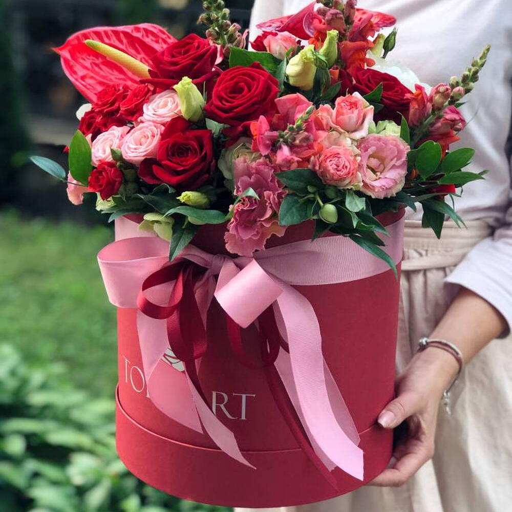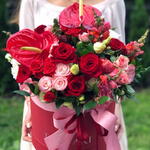 Composition : Rose branchue blanche Jeanine - 1, Heleborus - 1, Anthurium - 6, Rose rouge - 9, Lisianthus - 3, Rose branchue rouge importée - 4, Ruscus - 1, Boîte - 1, Ruban - 2, Mousseline - 1. Dimensions : Largeur - 30 cm ; Hauteur - 35 cm ; Longueur - 35 cm (emballage compris) Dimensions : 30 x 35 x 35 cm