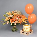 Eucalyptus - 1 pce Ruscus - 1 pce cake - 1000 g fleur de rose en spray pêche - 4 pce orange rose fleur - 6 pce tulipe orange - 2 pce lys asiatique orange - 2 pce fleur de chrysanthème orange - 2 pce spray de roses orange - 2 pce mini fleur séchée de palme bleue - 2 pce œillet orange clair - 3 pce ballons en latex orange - 2 pce