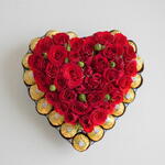 Un parfait mariage d'amour et de gourmandise : cette composition exquise met en scène 11 roses rouges éclatantes et 21 chocolats Ferrero Rocher, le tout élégamment présenté dans un coffret transparent en forme de cœur. Les roses symbolisent la passion et le romantisme, tandis que les chocolats apportent une touche de douceur irrésistible. Un cadeau inoubliable, idéal pour célébrer la Saint-Valentin, un anniversaire ou toute autre occasion spéciale où l'amour mérite une expression luxueuse. 🌹🍫 Pourquoi choisir entre fleurs et chocolats quand on peut offrir les deux ? Commandez dès maintenant et faites plaisir à votre bien-aimé(e) !