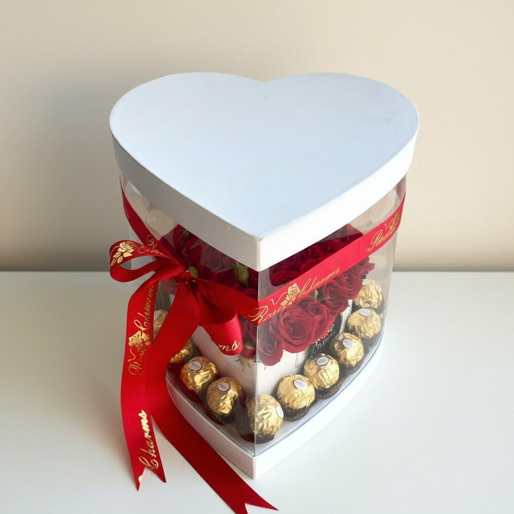 Un parfait mariage d'amour et de gourmandise : cette composition exquise met en scène 11 roses rouges éclatantes et 21 chocolats Ferrero Rocher, le tout élégamment présenté dans un coffret transparent en forme de cœur. Les roses symbolisent la passion et le romantisme, tandis que les chocolats apportent une touche de douceur irrésistible. Un cadeau inoubliable, idéal pour célébrer la Saint-Valentin, un anniversaire ou toute autre occasion spéciale où l'amour mérite une expression luxueuse. 🌹🍫 Pourquoi choisir entre fleurs et chocolats quand on peut offrir les deux ? Commandez dès maintenant et faites plaisir à votre bien-aimé(e) !