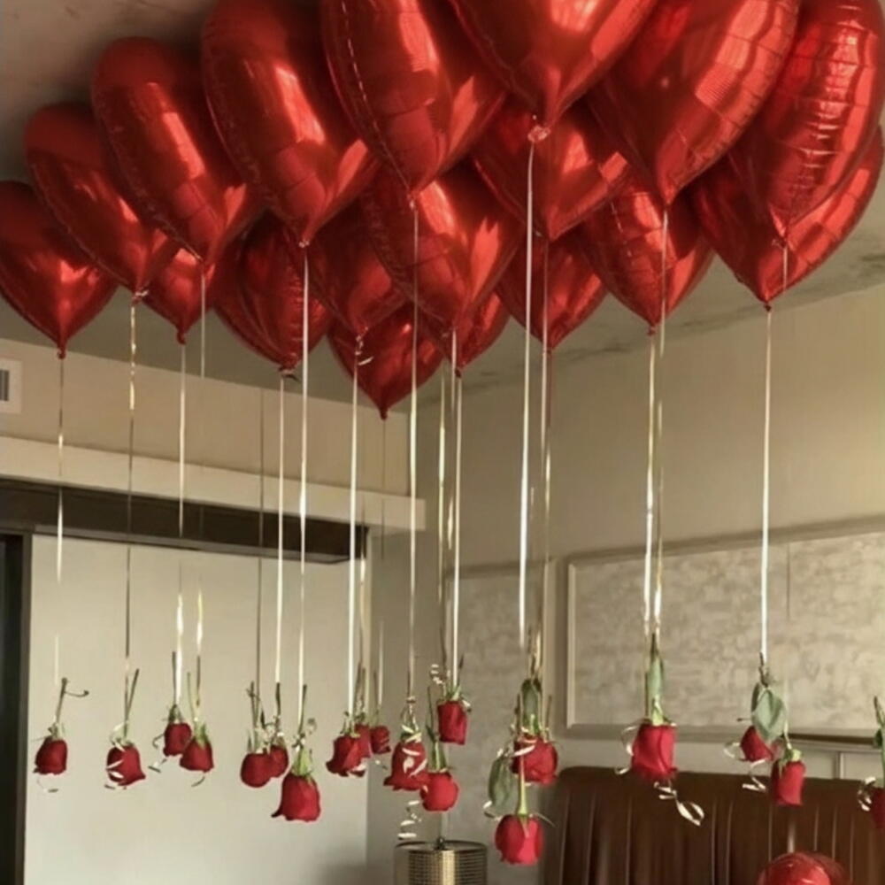 Ballons en mylar en forme de cœur romantiques, avec des roses rouges suspendues aux rubans, stylisés comme une décoration murale élégante pour un effet visuel spectaculaire. ✨ Veuillez noter : Ces ballons NE SONT PAS remplis d'hélium Les ballons sont solidement collés au mur à l'aide de pastilles adhésives amovibles Conçus uniquement pour une présentation décorative, et non pour flotter Parfaits pour des surprises dans la chambre, la décoration de chambres d'hôtel, les anniversaires, la Saint-Valentin, les demandes en mariage et les célébrations romantiques. 🌹 Les roses sont fixées à titre décoratif pour un aspect luxueux 📸 Idéal pour les photos et les mises en scène intimes 🚚 Retrait et livraison disponibles Créez une belle ambiance romantique sans besoin d'hélium.