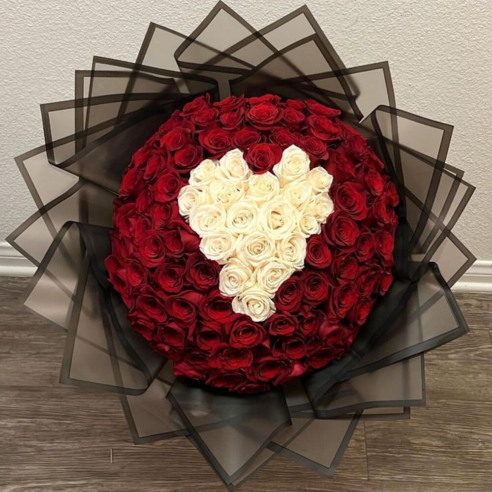 Le bouquet « Cœur d'Amour Éternel » est une magnifique expression de romantisme et de pureté, superbement agencé en forme de cœur. Composé d'un luxueux mélange de roses rouge profond et d'élégantes roses blanches, ce bouquet symbolise l'amour passionné et la dévotion sincère. Emballé avec soin dans du papier cadeau haut de gamme et orné d'un ruban classique, il est le choix idéal pour les anniversaires, les mariages, les demandes en mariage et toutes les célébrations qui font du bien. 50 roses rouges symbolisant l'amour profond et la passion 20 roses blanches représentant la pureté et la sincérité 8 feuilles de papier cadeau haut de gamme pour une présentation raffinée 1 ruban assorti pour une touche finale élégante Composition en forme de cœur idéale pour les occasions romantiques