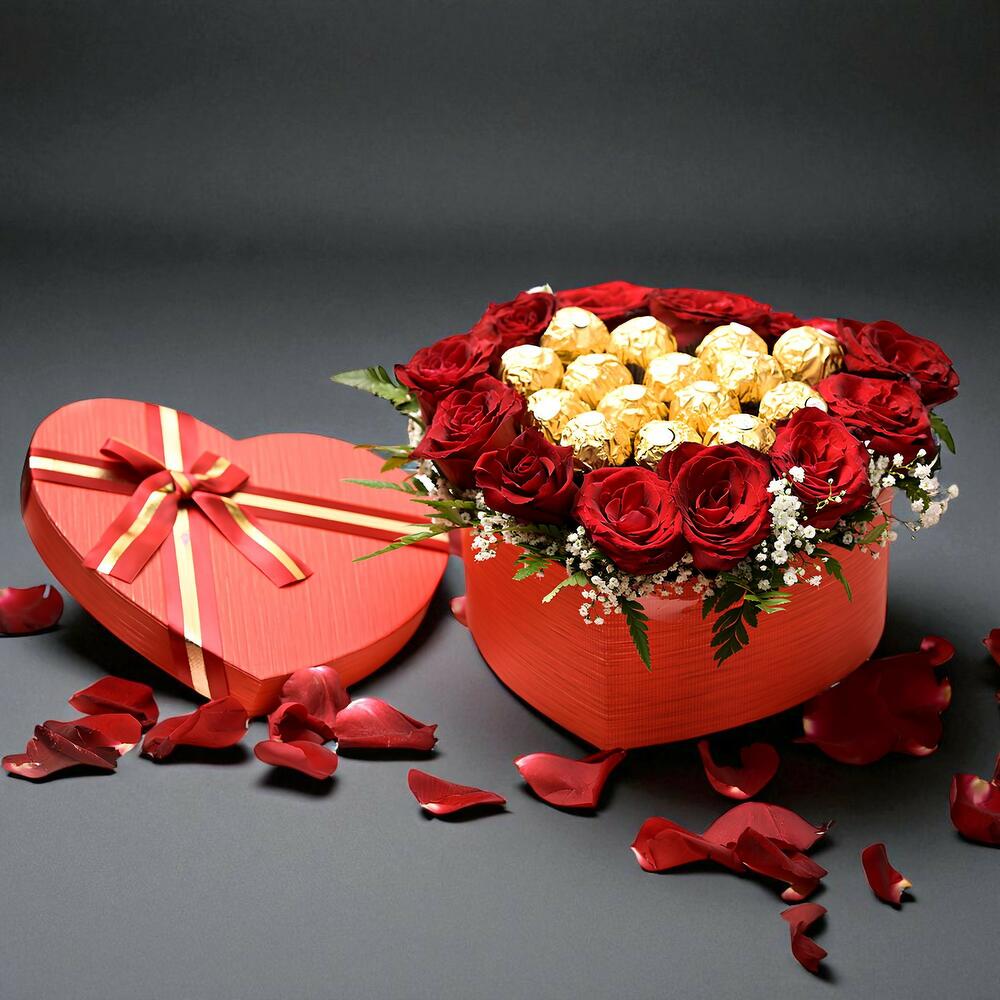 Boîte en forme de cœur avec des roses rouges et des Ferrero Rocher