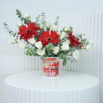 Product Description 3 Red Gerbera Daisies 4 White Baby Roses 2 Stem Eucalyptus Leaves Beautifully Arranged in a Red White Gradient Container Embellished with the Quote: Teaching is a work of heart.