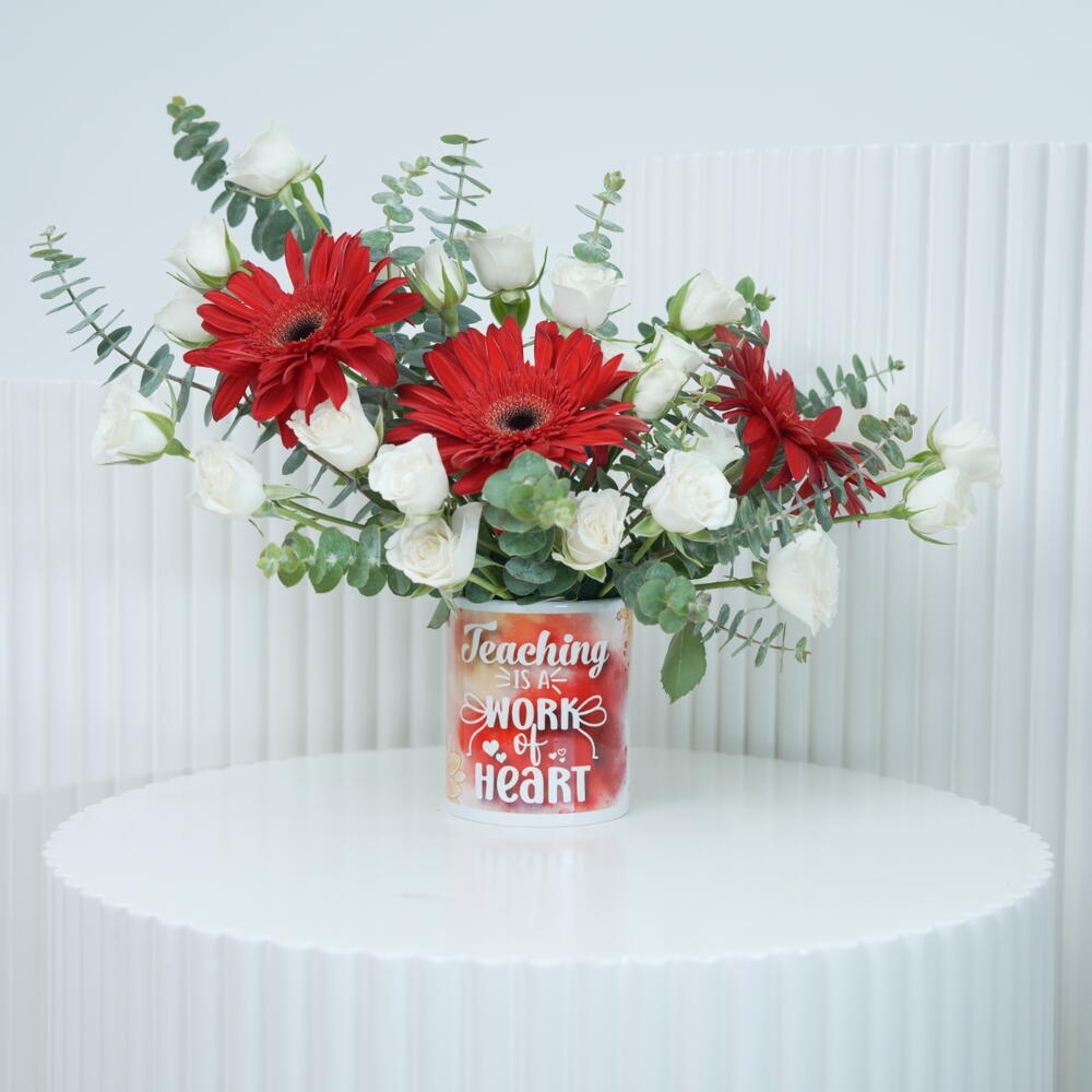 Product Description 3 Red Gerbera Daisies 4 White Baby Roses 2 Stem Eucalyptus Leaves Beautifully Arranged in a Red White Gradient Container Embellished with the Quote: Teaching is a work of heart.