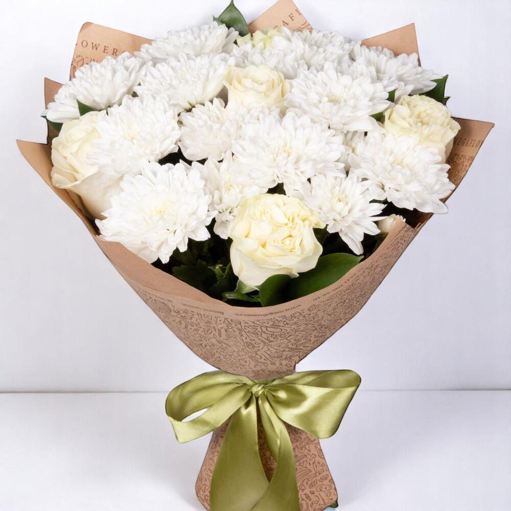 Harmonie charmante – bouquet de chrysanthèmes blancs et de roses