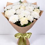 Élégant, serein et empreint de grâce, le bouquet Charming Harmony célèbre avec douceur l'amour et la tranquillité. Cette composition soigneusement sélectionnée est composée de 7 chrysanthèmes d'un blanc immaculé, associés à 5 roses blanc crème, le tout enveloppé à la main dans du papier kraft texturé et orné d'un soyeux ruban vert olive. Rayonnant de pureté, de loyauté et d'élégance, ce bouquet est parfait pour exprimer ses condoléances, sa gratitude ou des sentiments de paix en toute occasion. Conseils d'entretien : Coupez les tiges en biais avant de les placer dans un vase propre rempli d'eau fraîche. Changez l'eau quotidiennement et conservez le bouquet à l'abri de la lumière directe du soleil, de la chaleur et des courants d'air. Conservez-le dans un endroit frais pour préserver sa fraîcheur et sa beauté.